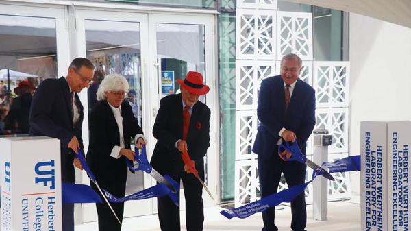 Donning his iconic red cowboy hat, Herbert Wertheim, the billionaire namesake of the latest addition to the College of Engineering, cut the ribbon for the new building just north of the Reitz Union.